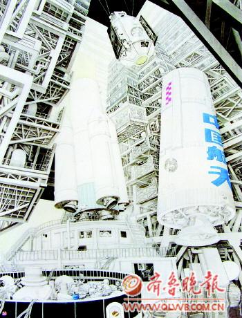 新时期航天作品 记:刚才提到的这幅航天创作属于您的代表性作品,您能简单介绍一下它的特点吗? 王:航天器材属于较为精密的仪器,刻画这种特殊题材需要特殊材料和手法的辅助,像以尺子标注、铅笔起草等方法来表现横平竖直的线条等。我的创作吸收了中国古代界画及西方绘画中立体、渲染的手法,作品在立足真实的同时,更加注重画面的灵动性和自我意识发挥:重新组合画面空间的光线、色调、疏密、层次;尝试各种视角,缩小人物形象以突出太空浩瀚;后期我还探索了不同的表现手法,将作品逐渐发展成现在的黑白构成模式。 记:现在尝试用传统水墨表现现代科技的作品并不多。 王:中国传统艺术自古被用来表现文人雅士之意趣,而我用它来表现“高、精、尖”的航天题材,将现代才出现的发射塔、飞行器、航天员列为重点描绘的对象,融入现代军事生活气息,使作品具备了更为鲜明的时代特征。