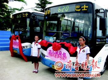 5月30日,在崂山晓望小学,学校学生和交运温馨巴士公司的员工一起为“花儿朵朵”号学生公交专线揭牌。王哥庄多个社区一直是公交线路的盲区,周围学校的上下学交通问题非常突出,去年3月,交运温馨巴士公司相继开通616,618,620,615四条公交线路,途经晓望小学、崂发小学、青山小学、黄山小学、求实中学等,每天运送学生千余人次。此次开通“花儿朵朵”号学生公交专线车,主要是方便学生上下学乘车。