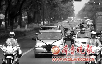 | 4日,在交警开道下,吴斌的灵车从杭州西湖边驶过。新华社发 |
