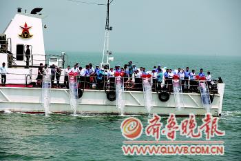 | 4日,船队在蓬莱海域实施增殖放流。 本报记者 刘红杰 通讯员 李云峰 摄 |