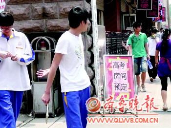 | 一家酒店门口摆出了“高考房间预订”的牌子,而时间在高考之后的学考已经一房难求了。 本报记者 李飞 摄 |