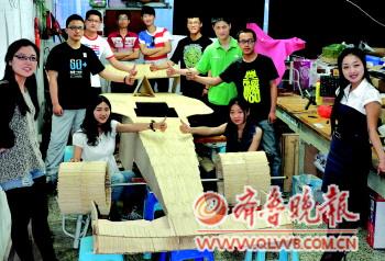 作品描述:家住毓璜顶附近的烟台姑娘贾婧(右一)给6月5日世界环境日送上一份大礼,她和同学们利用废弃的一次性筷子,按照1:1比例造出了一辆2011款F1赛车,整个制作过程超过了半年。