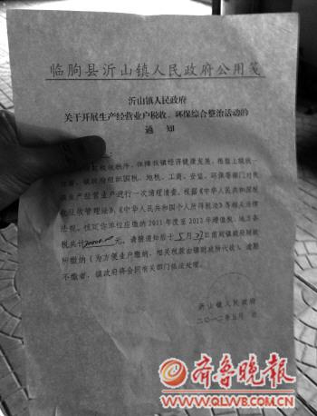 《通知》称逾期不缴将依法处理 6月4日,记者来到临朐县沂山镇,在王先生经营的水泥预制厂里,王先生给记者出示了他收到的《通知》。 记者看到,这份名为《沂山镇人民政府关于开展生产经营税收、环保综合整治活动的通知》上写着,“为规范税收秩序,保障我镇经济健康发展,根据上级统一部署,镇政府组织国税、地税、工商、安监、环保等部门对我镇生产经营业户进行一次清理清查。根据《中华人民共和国税收征收管理法》、《中华人民共和国个人所得税法》等相关法律法规,核定你单位应缴纳2011年度至2012年增值税、地方各税共计贰万元。请接通知后于5月27日前到镇政府财政所缴纳(为方便业户缴纳,相关税款由镇财政代收),逾期不缴者,镇政府将会同有关部门依法处理。” 王先生说,自己经营这个厂子五年,一年的利润大概在四五万元,工商等费用一直按时交。王先生称,只要这些费用收的合法,大家应该会支持的。但是,这两次来人催收费用,一直没有给自己列出个明细,具体哪项要收多少,为什么,自己全然不知。而且交两万元,自己“半年就白干了”。记者随后在沂山镇周边的几个村子转了一圈发现,收到这份通知的厂主还真不少。记者随机采访的八家板材、石材加工企业,全都收到了这份通知。其中,经营板材生意的要交一万元,石材和水泥预制生意的要交两万元。 经营板材生意的张女士告诉记者,对方称不交钱,要给自己厂子断电停产。自己和丈夫正在为此而纠结,“本来一年也就收入个三四万,这下真没法干了。” 在通往九山方向的一家经营了五六年的水泥预制厂,厂主告诉记者,他们每年都缴纳一部分费用,但钱数没有定额,去年交了3000元,而前几年交几百元就完事。征收钱款的人员,每次征收费用后只是给一个收据,也没有印章。 据了解,目前,厂主们没有上交费用。 相关人员:治理是为了更好地规划发展 4日下午,记者来到沂山镇政府,一位负责人接受采访时表示,近年来,沂山镇强化了生态建设,突出了环境保护。在发展上县委、县政府也给予明确定位,不准涉污企业、破坏生态的企业落户沂山。按照这一定位,沂山镇决心在生态保护上狠下功夫,但近几年,该镇农村出现了一种不容忽视的现象,毁林上马扒板的作坊如雨后春笋,这些小作坊规模不大,发展毫无规划,有的占路经营,有的私占粮田,完全处于无政府状态,处于无序发展局面,并且盗采毁林现象时有发生,破坏了生态建设成果,还有水泥预制厂、石材加工厂等等,都不同程序存在以上现象。这些经营业主私自经营,没有依法纳税的意识,广大群众和所在村两委反应强烈。 应对广大群众的反应,为保障沂山镇经济社会健康发展,规范发展秩序,镇党委、政府在充分调研的基础上,决定从规范税收秩序入手,在县国税、地税部门的指导下,组织国税、地税、工商、安监、环保等单位组成工作小组,对全镇所有小企业、小作坊进行清理整顿。整顿的目的是:规范企业发展,关停非法涉污企业,增强群众的依法纳税情况。 对于厂主们纷纷抗议缴纳税一事,该负责人称,因为之前一段时间这些小企业刚刚起步,也没有一个统一的标准,所以一直没有规范起来。现在让大家缴税,大家一时难以适应。再一个,该工作人员也表示,可能是工作人员没有向厂主们讲解清楚,下一步将会把工作做细做实。 而对于一万元和两万元费用征收的标准,该工作人员称,这些都是之前厂主没有缴纳,积攒到一起的,所收的费用都是有理有据的。 对于处罚措施,该负责人称,目前处在下发通知阶段,核定数额是按照企业生产规模,根据《中华人民共和国税收征收管理法》、《中华人民共和国个人所得税法》等相关法律法规,对2011年、2012年两年的增值税、地方各税合计而成。目前也没有组织队伍进企业采取强制措施,对于为什么组织相关单位成立班子,镇里主要考虑到,沂山镇当前的小企业都存在重大安全隐患,特别是扒板企业,无一家有防火设备,一旦发生火灾,后果不堪设想。因此,由工商、安监、环保介入,对无任何手续的企业进行整治。