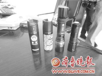 ◤王某的专用作案工具:手电筒与催泪喷射器。 本报记者 邢孟 摄 |  | |