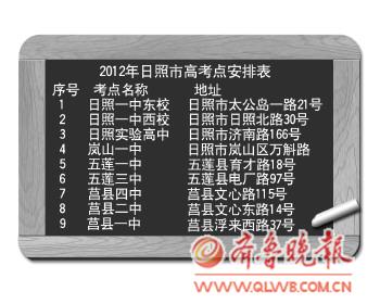 本报6月4日讯(记者 张萍) 即将高考了,不少高三考生都对考场充满了好奇与期待。4日,记者从有关部门获悉,6日下午开始,日照市9个考点将全部对外开放,考生可到考场查看座位,避免考试当天找考场难以找到。 据记者了解,今年高考日照共设9个考点,其中市区3个考点,岚山区1个考点,五莲县2个考点,莒县3个考点。 2012年高考将于6月7日至9日进行,7日上午9:00至11:30首先进行语文考试,15:00至17:00进行数学考试。8日上午是文科综合/理科综合考试,下午安排外语考试;基本能力考试是最后一科,安排在9日上午的9:00至11:00。 考试满分为750分,其中语文、数学、外语试题满分各为150分,外语中含听力测试满分30分;文科综合和理科综合试题满分各为240分;基本能力测试试题分值为100分,以考生答题得分的60%计入高考总分。 文化课成绩将于6月25日前公布。
