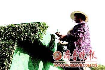 4日下午,园林工人正在海天绿地用五色草给立体植物雕塑《船》“穿花衣”。 本报记者 刘涛 摄