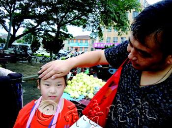 | 黄诗润的爸爸在为她擦汗。 见习记者 于飞 摄 |