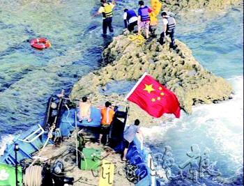 | ▲15日,载有14名保钓人士的香港保钓船抵达钓鱼岛,保钓人士高举国旗登岛成功;保钓船行进中遭日船撞击受损,无人受伤。 |