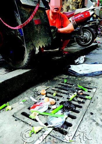| 15日,记者在济南纬十路附近看到,一些市民将生活垃圾倒进井箅子里造成地下排水管道堵塞。本报记者 王媛 摄 |