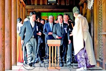 | ▲8月15日,日本内阁国土交通大臣羽田雄一郎(左一)等人参拜靖国神社。 (宗禾) |