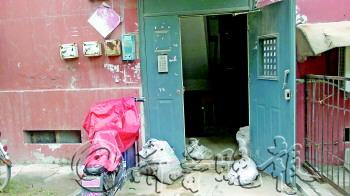 | ◤14日,济柴九宿舍七号楼前堆着沙袋。
