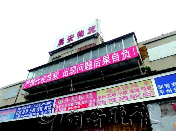 | ◤一家物流市场管理办公室门外,贴上了“严禁代收货款”的标语。 |  | ▲在盖世物流中心,凯诺双骏物流公司没有续交房租,还欠一位客户3万元代收款,被市场办公室贴上了封条。 |