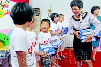 本报8月15日讯(记者 修从涛) 15日,张刚大篷车“梦想快车”带着30台语言复读机和176套新衣服来到了济南瑞峰听觉言语康复中心。收到新衣服和复读机的孩子们高兴得像是过节。 “一共176套新衣服,88个聋哑儿童每人两套,春夏装各一套。复读机一共是30台,来自农村的孩子每人一台。”15日一早,明湖珠宝城和济南尚玉珠宝的圆梦志愿者就带着为孩子们准备的圆梦礼物来到了济南瑞峰听觉言语康复中心。 “小朋友过来试试衣服合不合身。”明湖珠宝城的连女士和济南尚玉珠宝的吕女士把新衣服给孩子们穿起来。试穿了长袖春装的小士潭用手拽着衣服都不舍得脱下来;穿上新衣服的丁浩翔眉开眼笑,尽管他不能用流利的话语来表达自己的想法,但是手舞足蹈的肢体语言已足以表现出内心的兴奋。 康复中心的88个孩子每人都有了春夏2套新衣服,不仅如此,来自农村的30名困难家庭的孩子还各自收到了一台语言复读机。“在语训课上老师帮孩子们练习发音,有了语言复读机后,孩子们也可以在课下跟着复读机练习发音了。”康复中心副主任张庆娟说。为了表达感谢,孩子们还给送来礼物的圆梦志愿者表演了节目。虽然这些孩子有听力障碍,但在老师的手势指导下,舞蹈《大家一起来》表现出孩子们的天真烂漫。 为了让这些特殊的孩子做语训康复治疗,不少家庭被高额的治疗费累垮,尤其是那些来自农村的困难家庭,两地奔波为孩子做治疗已无力再为孩子添一台语言复读机,有的孩子甚至一年到头只穿一身衣服。此次张刚大篷车“梦想快车”给孩子们带来了复读机和新衣服,圆了孩子们的梦,孩子们快乐得像是过节一样。