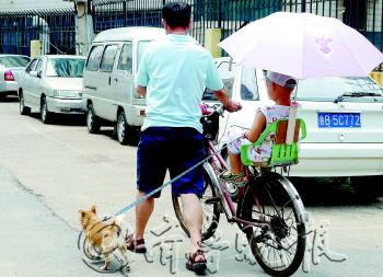 自述:老人载着孩子,孩子牵着狗狗一同出行。