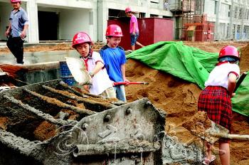 | ▲孩子们学习搅拌,乐此不疲。 |  | 快乐的“建筑队” |