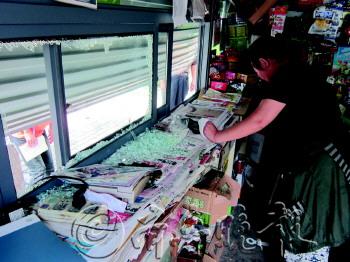 | 董先生说,报亭卷帘门被撬,窗户玻璃被砸碎。