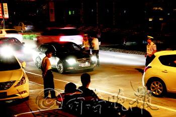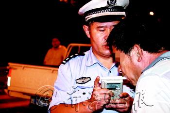 | 15日晚,民警正在对疑似酒驾者进行酒精测试。 本版图片/本报记者 刘涛 摄 |  | ◤15日晚,日照交警直属大队在市区部分路口设卡查处酒驾行为。
