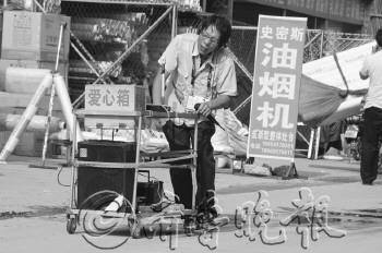 | ◤正在沿街唱歌的张钦波。 本报记者 李运恒 摄 |
