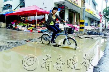 本报8月15日讯 (记者 孙慧瑶 见习记者 王鑫) 由于道路翻新,张店区西二路与城中西内环路交会处出现大坑,近日淄博连续降雨,坑中积水,给行人带来不便。 “路还没修好,昨天下了一天的雨,更是没法走了。”在路边卖水果的销售商向记者介绍。记者目测,最大的一个坑有两米宽,十几厘米深。在10分钟的时间里,记者看到有13名骑电动车或摩托车的行人到了路口后又掉头选择走其他路,而骑自行车的则选择搬车而过。“从昨天下雨开始,积水太深,得搬着自行车走。”一位家住城中西内环路附近的女士说。 “昨天下大雨,男性力气大可以握得住车把,女性有好几个车把被石头别住摔倒。”路边商贩指着水坑说。由于水坑较深,记者看到一辆大众帕萨特和东风雪铁龙汽车底盘被水坑沿担住。 西二路道路整修的负责人说:“自6月份西二路进行道路整修以来,一直处于封路状况。因西二路修路还未完成,现在只是主路开通,人行道和道路接口处还没有修好,我们会进行统一整修。”随即,道路整修工作人员将大坑进行了简单填埋,以保证行人安全。 (奖励线索提供者话费100元)