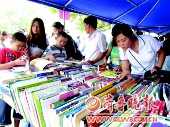 第二十六届泰山国际登山节2012秋季图书展销会9月9日上午在泰山书城举行,山东出版集团10家出版社和全国各大出版、发行单位360余家参展,展出图书、电子音像制品14万种。图为市民争相挑书。
