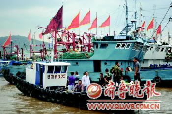 | 16日,浙江象山石浦港的渔民将生活物资托运至渔船上,准备出海。 新华社发