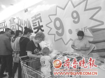 本报9月16日讯(记者 王红) 正版新书论斤卖,这种卖书模式还挺少见。16日,记者在一超市看到,大量图书摆放在称斤售卖的专柜上,专柜后面的海报上标明“图书外卖9.9元/斤”,一旁还摆了一个电子秤,不断有顾客称秤购书。 16日,记者在芝罘区一超市入口看到,销售专柜上摆满了各种图书,而专柜后面的宣传海报上则标明了“图书外卖9.9元/斤”。图书范围比较广泛,有儿童读物、文学类图书和科普类。 市民张先生给女儿一次性选购了四本儿童读物,上秤称重约两斤,每斤9.9元,一共19.8元。而按照图书原价,四本书共需103元。 该超市百货部经理陶先生告诉记者,称重售书促销活动开展以来,消费者反响比较好,每天的销售额都在4000元以上,也就是说,每天图书销量能达到400多斤。 对于这种售书方式,有消费者持怀疑态度。56岁的王先生在售书专柜前直摇头,“图书论斤卖,文化知识的价值被狠狠打折了!” 而销售人员则认为,按斤卖书只是一种促销手段,图书打折但读者从书中获得的知识并不会打折,真正地实现了低投入,高回报。