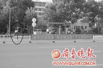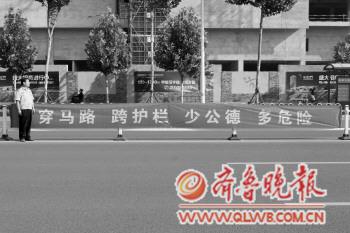 本报连续报道了淄博技师学院学生跨栏上学后,16日,记者从淄博市技师学院了解到,为了禁止学生跨栏,学校在北门附近防护栏上悬挂了禁止跨栏的条幅,并安排保卫人员每天上学、放学时间在移动大厦站牌处值班,对学生的跨栏行为进行劝导。此举对制止学生跨栏起到一定效果,但是仍有市民从这里跨栏过马路。 本报记者 姜文洁 张汝树 摄影报道