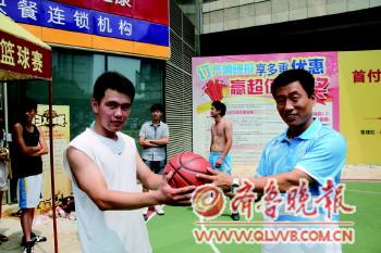 |  | ▲2012年7月7日,“三人篮球赛”完美收官。总裁判将纪念篮球颁发给MVP球员杨帆。 本报记者 孙建 摄 |  | ◤京鲁男篮争霸赛上,球员精彩的投篮博得满堂彩。本报记者 赵金阳 摄