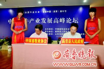 25日,黑牛产业国际高端论坛在高青县召开。高青县政府与中国畜牧业协会签署山东黑牛发展战略合作协议,自此高青县的黑牛产业上了一个新台阶。目前高青县正积极整合资源,推动黑牛产业发展,力争在“十二五”末形成百亿元黑牛产业链。