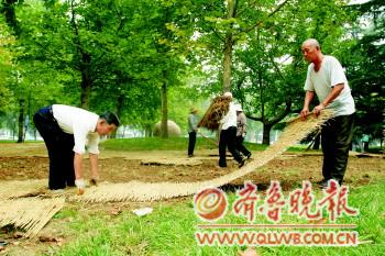 9月26日,在淄博市人民公园,工作人员正在对部分草皮进行补植。据工作人员介绍,补植的草籽将会在“十一”期间发芽,长成新的草皮。