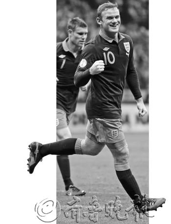 ◥10月17日,英格兰队球员鲁尼(前)庆祝进球。当日,在2014年巴西世界杯欧洲区预选赛H组比赛中,英格兰队客场以1:1战平波兰队。   新华社发