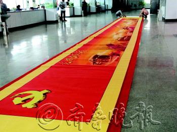 宁阳县18名高级绣工,历时4个多月绣制506万针,完成以“光辉的历程”为主题的21米长巨幅十字绣,为即将召开的党的十八大献礼。