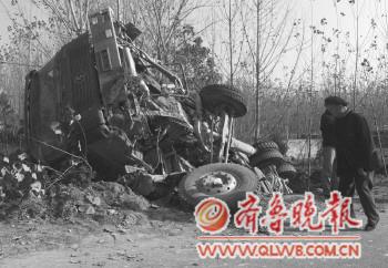 10月30日上午,在聊临路斗虎屯镇附近,一辆货车翻进路边沟内,动弹不得,幸无人员伤亡。