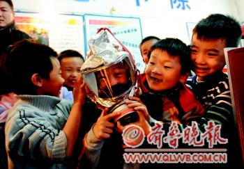 10日,山师附小一年级二班将安全实践课堂搬进了济南消防茂岭山中队,通过参观消防器材、讲解消防知识让孩子们掌握消防本领,图为小学生在试戴逃生器具。