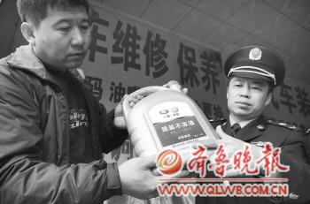 11月10日,淄川工商分局工作人员正在检查汽车防冻液。受冷空气的影响,当日淄博气温降到-1℃。为保证广大消费者的合法权益,淄川工商分局组织开展了防冻液市场专项整治行动,主要检查商家所售防冻液是否合格、有无过期、有无趁机涨价等行为,做到“检查一家、合格一家”。