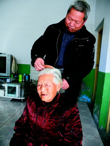 杨国田在给岳母梳头。 本报记者 于荣花 摄