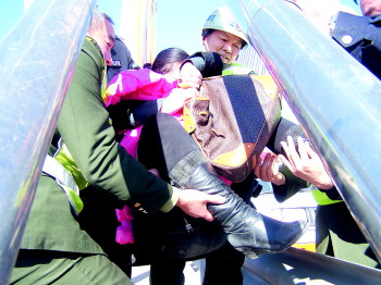 19日中午12时许,在黄河大桥上,一女子因为跟丈夫闹了别扭,怀抱1岁的孩子坐在安全护栏和桥栏杆之间哭泣,声言要跳河轻生。路政工作人员和民警合力将其救下,后又联系其丈夫将娘儿俩接回。 贺培嵩 摄