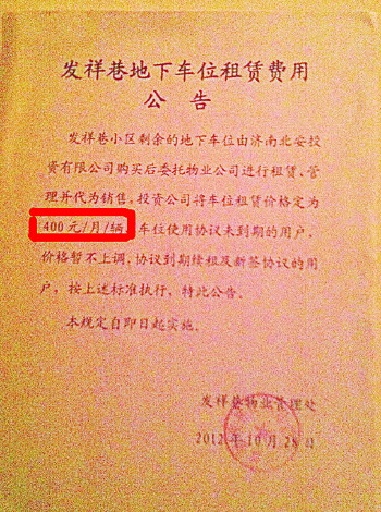 在王女士的指引下,记者在小区地下车库的入口处看到,小区物业10月28日贴出的公告书上,车位租赁价格已经标明为400元/月/辆。“之前每月350元的租赁费就已经感觉很高了,但当时没有相应的规定,也没什么办法,就先和物业签了一年的租赁合同。”现在政府有了指导价,停车费价格竟超出了近一倍,王女士决定不再续租,把车停在小区外面。