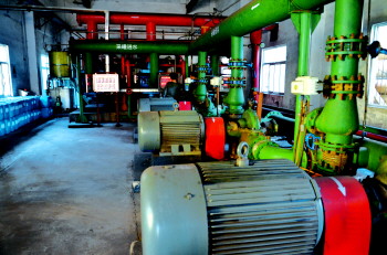 ◥济钢1号高炉泵站内,冲渣水在这里换热。 本报记者 王光照 摄