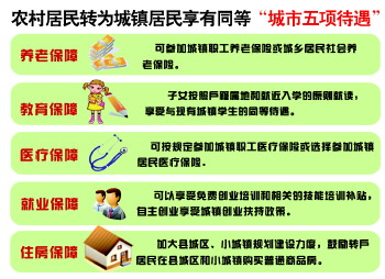 农村居民转入城镇户口之后,便享有同等的“城市五项待遇”。这其中包括养老保障、教育保障、医疗保障、就业保障和住房保障。与此同时,相关的职能部门都制订了详细的实施细则,使其具有可操作性。