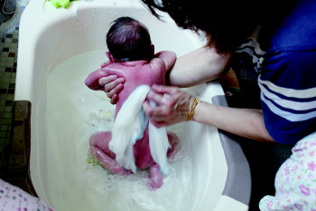 ◤一名月嫂正在给婴儿洗澡。  本报记者 龚海 摄