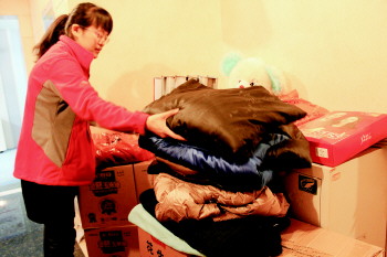 工作人员将热心市民捐助的过冬物资进行整理分类。 本报记者 修从涛 摄