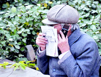 自述:为防别人听到,一老人用报纸遮面悄声打电话。