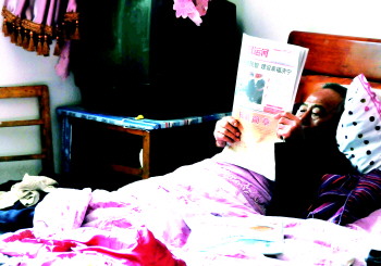 19日中午,一位老人在家中盖着被子读报。李岩松 摄