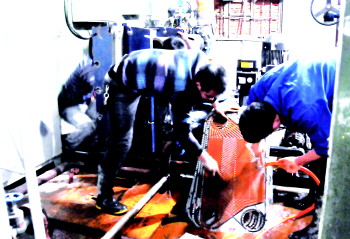 在小区西侧的换热站里,几名工作人员正在清洗换热片。两名工作人名一边用清水冲洗,地上都是红色的污水。“这上面都是电焊残渣,主要是新近安装的暖气管道里的。”一工作人员解释说,13日晚上该小区才完成并管,他们也是19日才发现换热片上有附着物的。