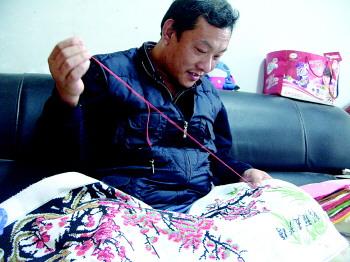 一米八的大男人,安静地坐在椅子上,一针一线绣十字绣,而且他的作品一点不比巾帼英雄们差。他绣的“一帆风顺”、“五福拜寿”、“梅兰竹菊”等作品,装裱起来后,受到亲朋好友的称赞。