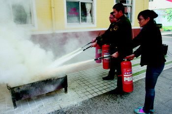 19日,在潍坊市奎文外国语幼儿园,消防队员和幼儿园老师进行灭火演练。为了做好冬季防火,以及出现火灾时正确使用灭火器,幼儿园联合消防部门进行了一次消防演练,让学生和老师更好的掌握了出现突发情况时的应对方法。
