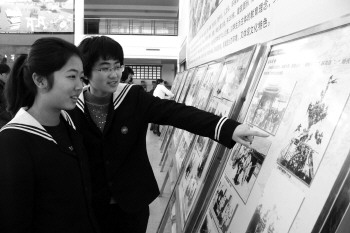 19日,在潍坊一中图书馆内,“老潍县图片展”引来不少学生驻足观赏。 本报记者 吴凡 摄