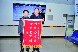11月9日上午,安徽籍打工者沈洪春来到竹岛派出所,将一面印有“为民办实事,心系老百姓”的锦旗赠送给塔山社区民警戚恩雨。