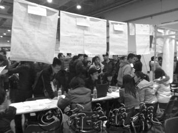 本报11月25日讯(记者 杨林) 25日上午,青岛市人力资源和社会保障局与中国海洋大学等20所高校联合举办的“送岗位进校园”大型招聘会举行,吸引了4万余名应届毕业生参加。 在25日的招聘会上,近千家企业提供了2万余个就业岗位,记者在招聘会上转了一圈发现,发现尽管绝大多数企业对应聘者的学历要求以专科、本科为主,但不少在读的研究生也来提前熟悉一下单位的用人要求。 “我们看上的公司看不上我们,公司看上我们我们又看不上公司。”来自青岛科技大学化工专业的王晓彤正在一家化工企业前投简历。她告诉记者,往年都有外企来学校招人,但今年来的企业少了,在学校参加了几次企业宣讲会以后,她决定来招聘会上试一试。和王晓彤一起来的还有同专业的刘洋,虽然今年已经保送了研究生,她也在找心仪的单位投简历。“先看看自己能不能达到用人单位的要求吧。”刘洋说,其实化工专业有的单位还是要求研究生专业,因为本科学的太少。自己虽然保送了研究生,还是对未来的就业没有把握。 来自中国海洋大学的李欣也抱有同样的想法。“如果包吃包住的话,一个月两三千的工资也可以。”李欣说,虽然今年保送了研究生,但得知有招聘会后,还是第一时间赶过来。如果单位不提供包吃包住,她希望的工资在三四千元以上。考虑到研究生课程不多,她想提前找个工作锻炼一下,了解一下用人单位的要求。 记者查看了多家用人单位接收的简历发现,不少准研究生赫然在目。中国建筑装饰集团有限公司华东分公司的柴经理认为,招来的应届生前两年基本都是公司往里搭钱培养,但只要应聘者有五六年的工作经验,公司并不在意他的学历。所以如果一些在校研究生提前工作,会弥补实践经验的不足。